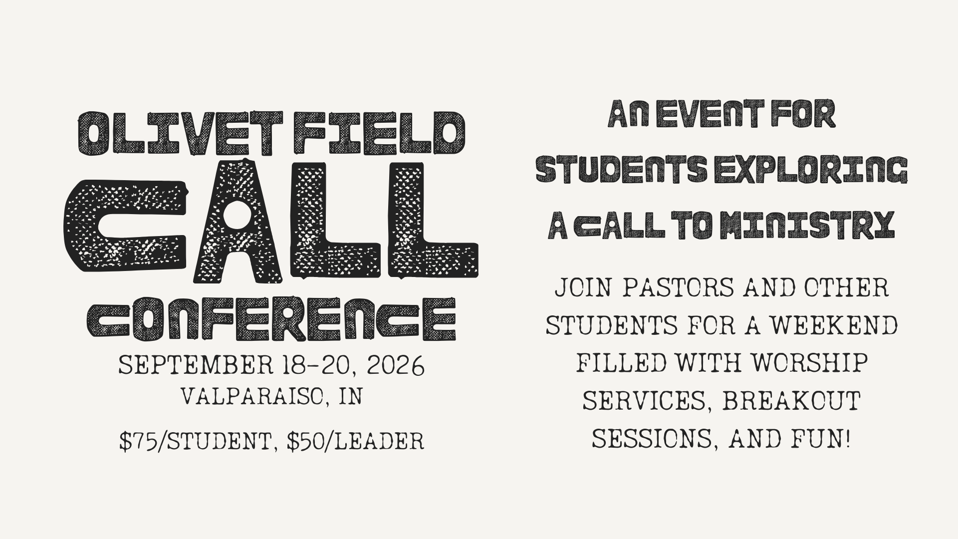 Join us for an inspiring weekend designed for high school students considering a call to ministry! Central Field's Call Conference offers a mix of sessions, workshops, and fun activities to help students discern God’s direction for their lives.
